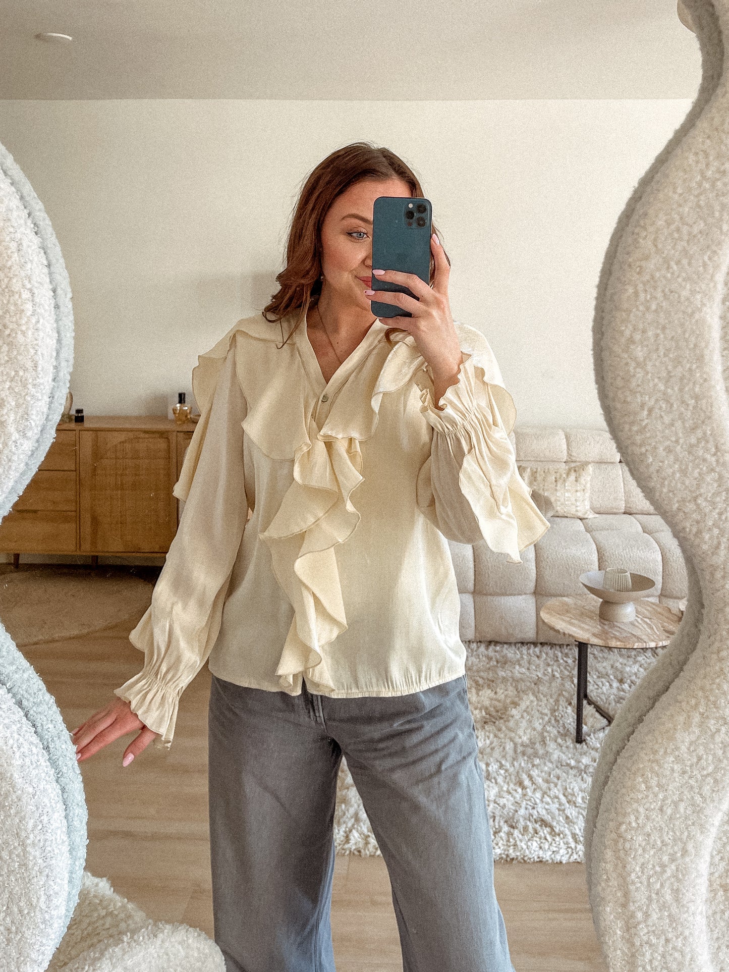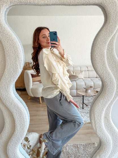 Upgrade je lentegarderobe met deze stijlvolle blouse uit de 'Pretty Pastels' collectie! De Bibi Blouse heeft lange mouwen met prachtige volants en een ruffle, die een speelse en vrouwelijke uitstraling geven. De blouse heeft een glimmende look en is voorzien van knoopjes aan de voorkant.