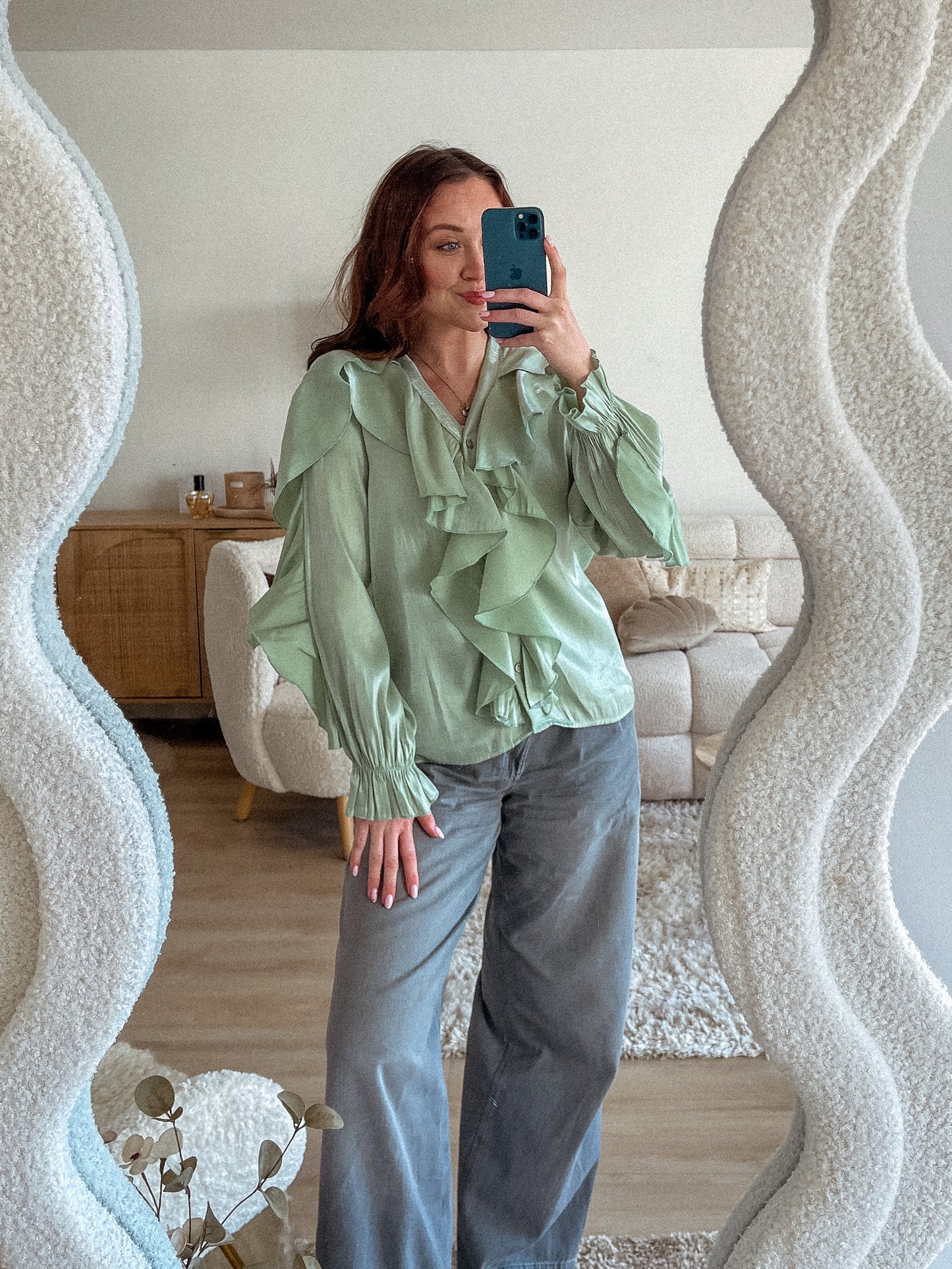De Bibi Blouse is er in drie mooie kleuren van dit moment: zacht groen, roze en beige!